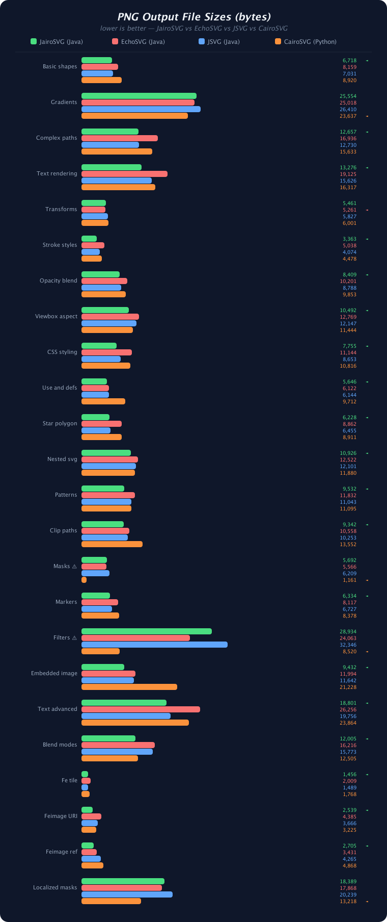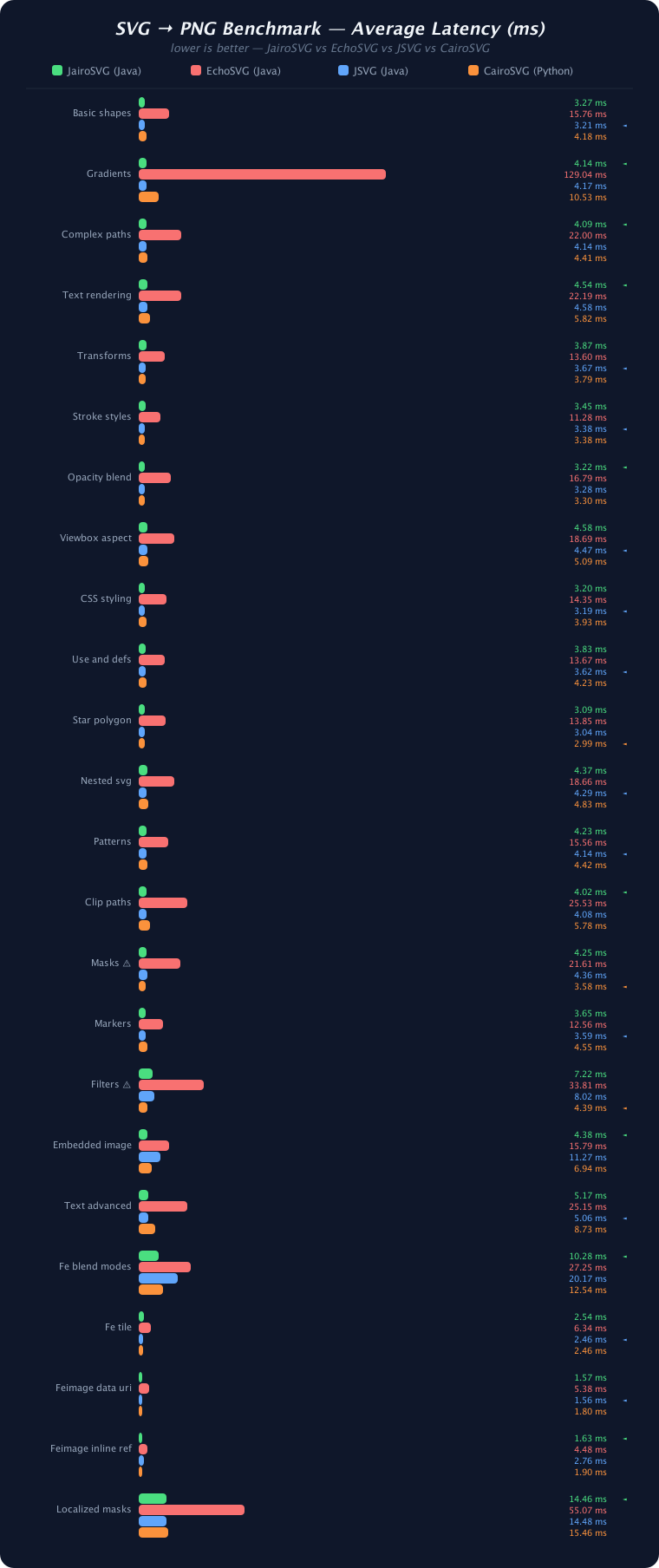 - JairoSVG is 3–29× faster than EchoSVG across all test cases